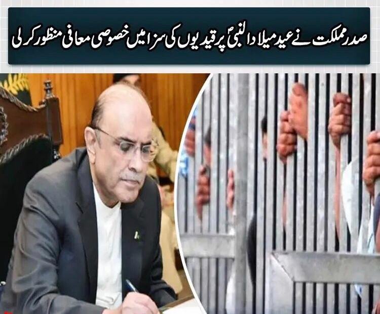 صدر آصف علی زرداری نے عید میلاد النبی پر قیدیوں کی سا میں 180 روز کی خصوصی معافی منظور کر لی۔صدر مملکت آصف علی زرداری کی جانب سے یہ معافی آئین کے آرٹیکل 45 کے تحت وزیراعظم کی مشاورت اور اتفاق رائے سے دی گئ۔وفاقی کابینہ نے 100 روز کی معافی کی شفارش کی تھی مشاورت کے بعد صدر اور وزیراعظم نے اس بڑھا کر 180 روز کر دیا۔خصوصی معافی آن قیدیوں پر لوگو ہو گئ جو قانون کے مطابق قانون پر پورا اترتے ہیں۔قتل، دشت گردی، جاسوسی اور بڑے مالیاتی جرائم میں سزا یافتہ قیدیوں کو معافی نہیں ملے گئ۔